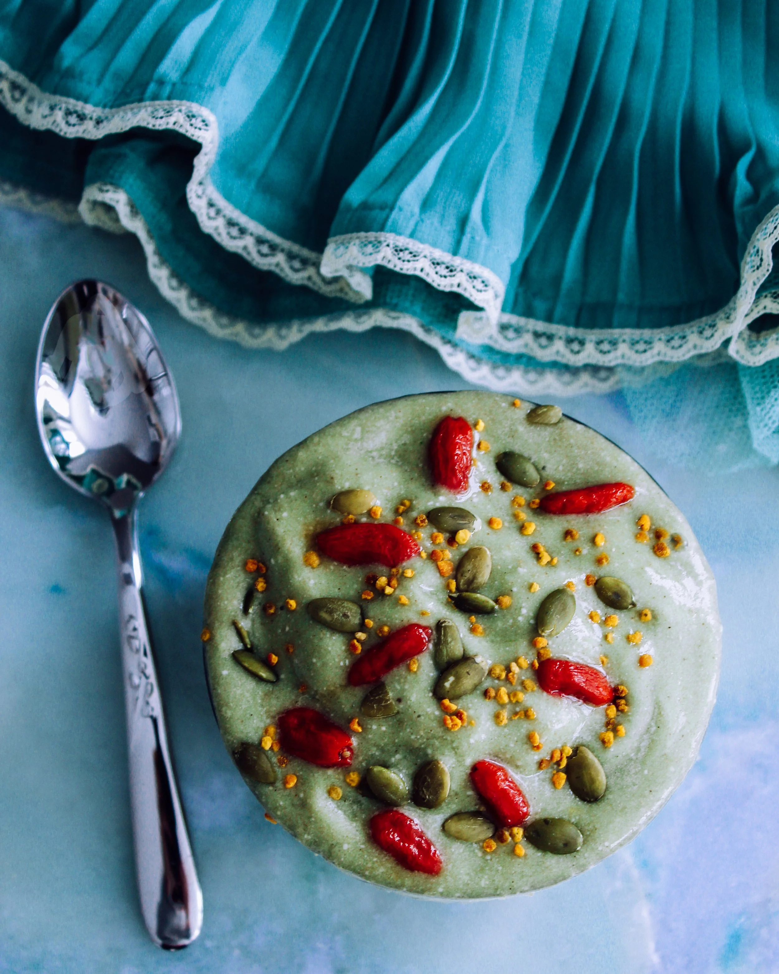 Smoothie préparé avec bananes, ananas, jeunes épinards, spiruline, graines de tournesol, protéine de chanvre, noix de coco râpée, eau de coco et poudre de feuilles de Moringa Oleifera. Décoré avec des baies de goji pré-trempées, du pollen d'abeille et des graines de citrouille.